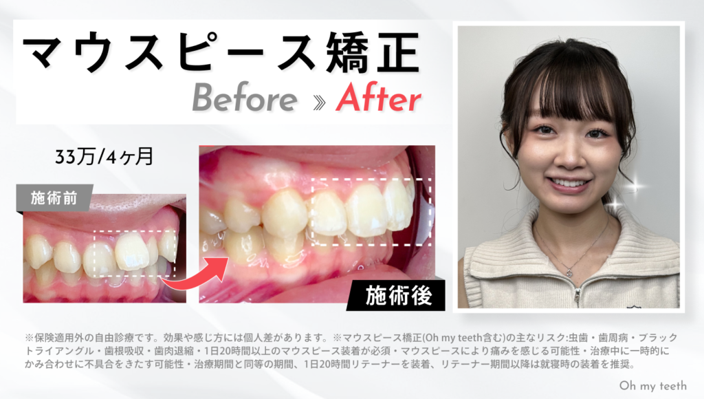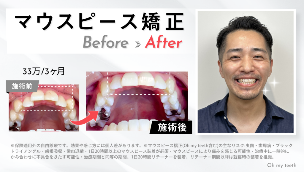 ここからは、Oh my teeth(マウスピース矯正)を使って実際に治療したケースを交えながら、「前歯だけで対応できる可能性が高い症例」と「前歯だけでは対応が難しいケース」を整理していきます。